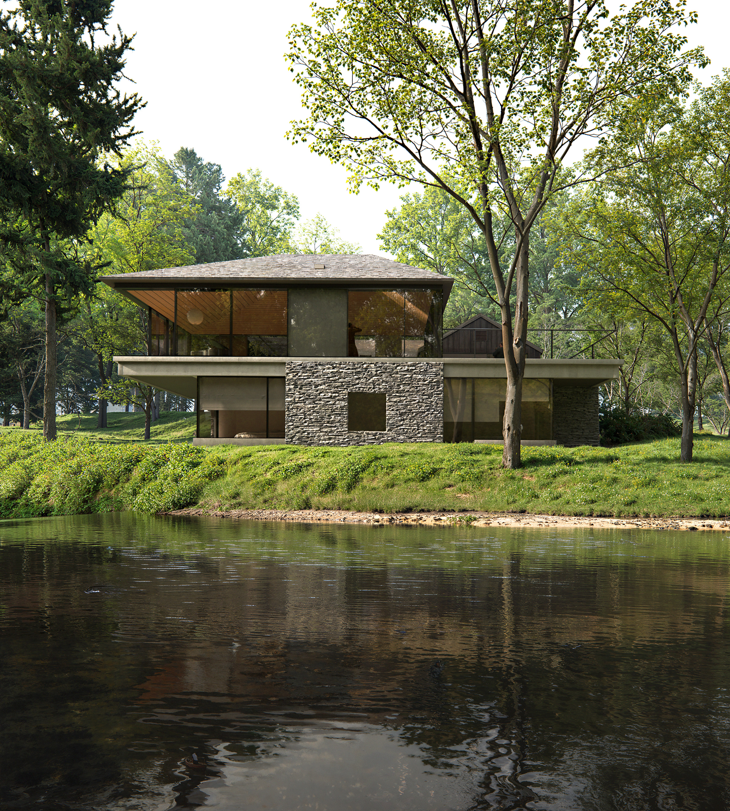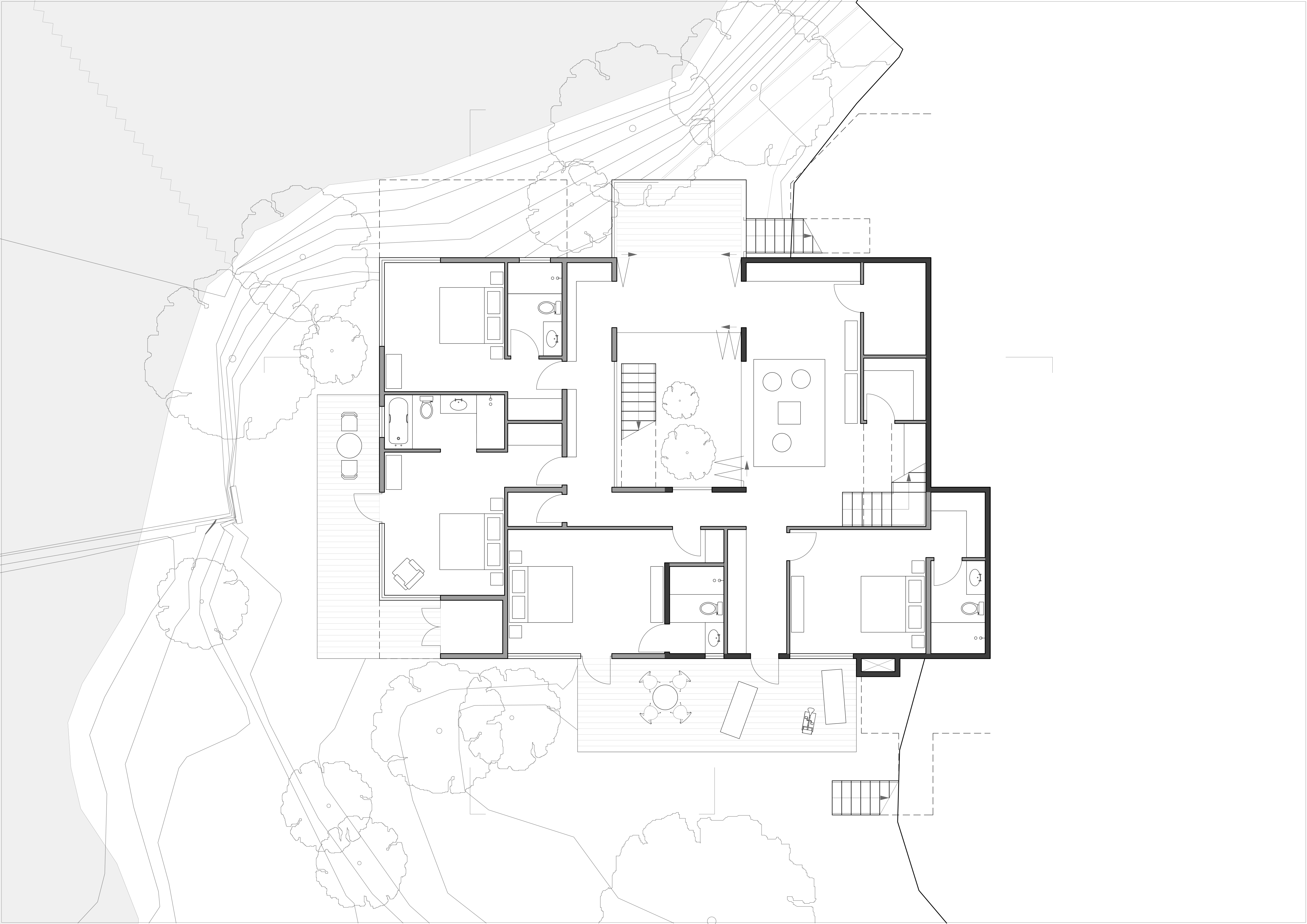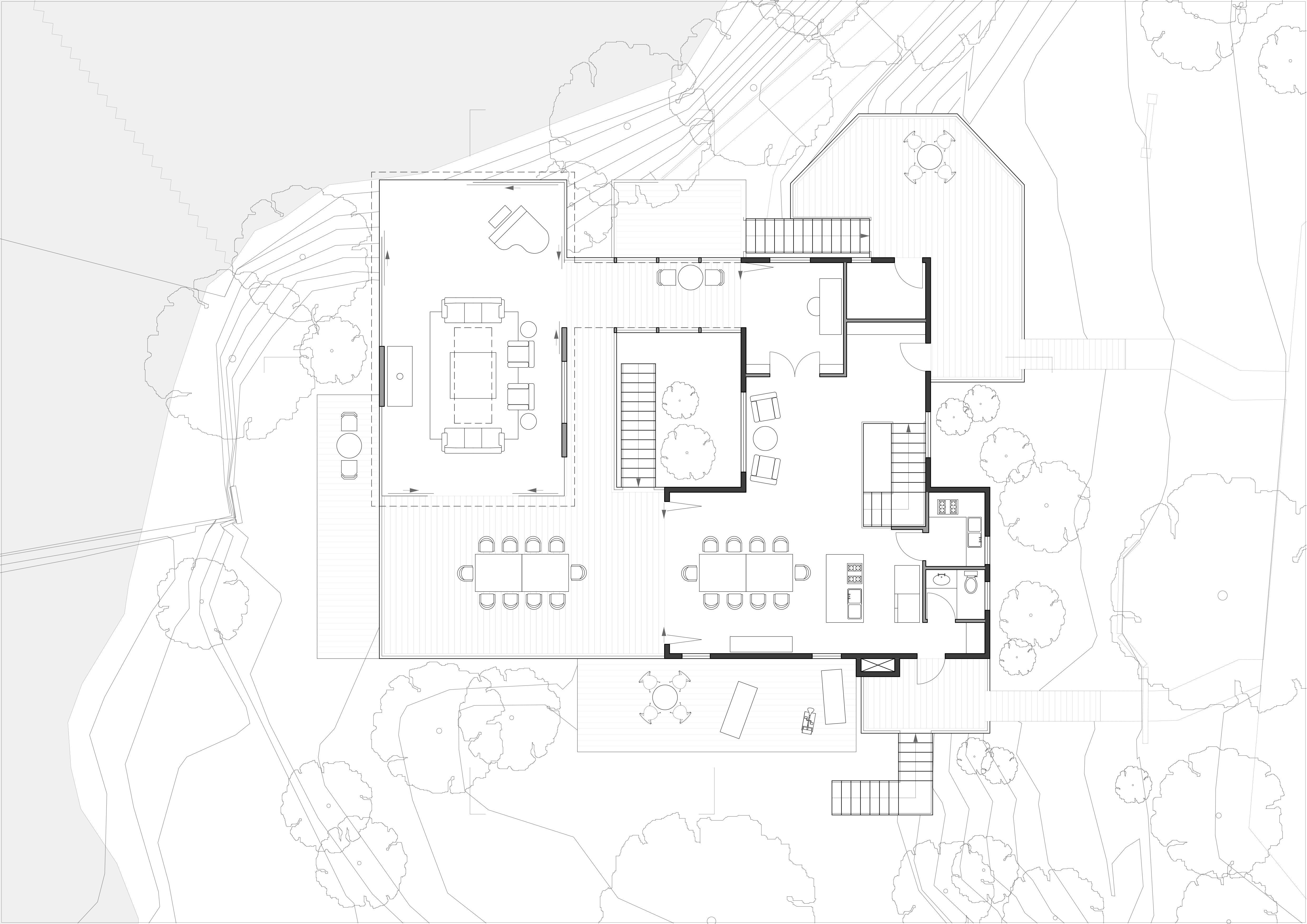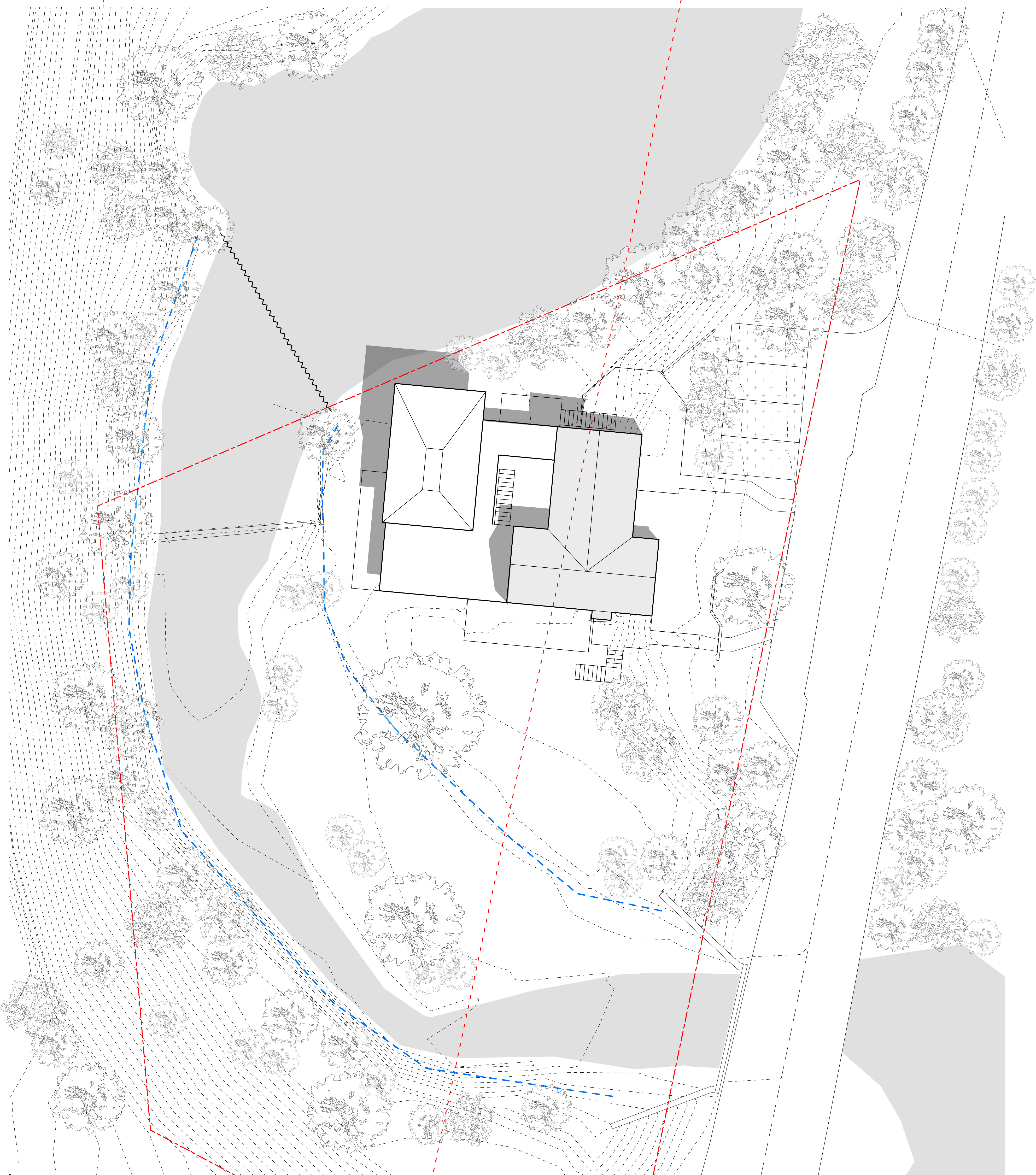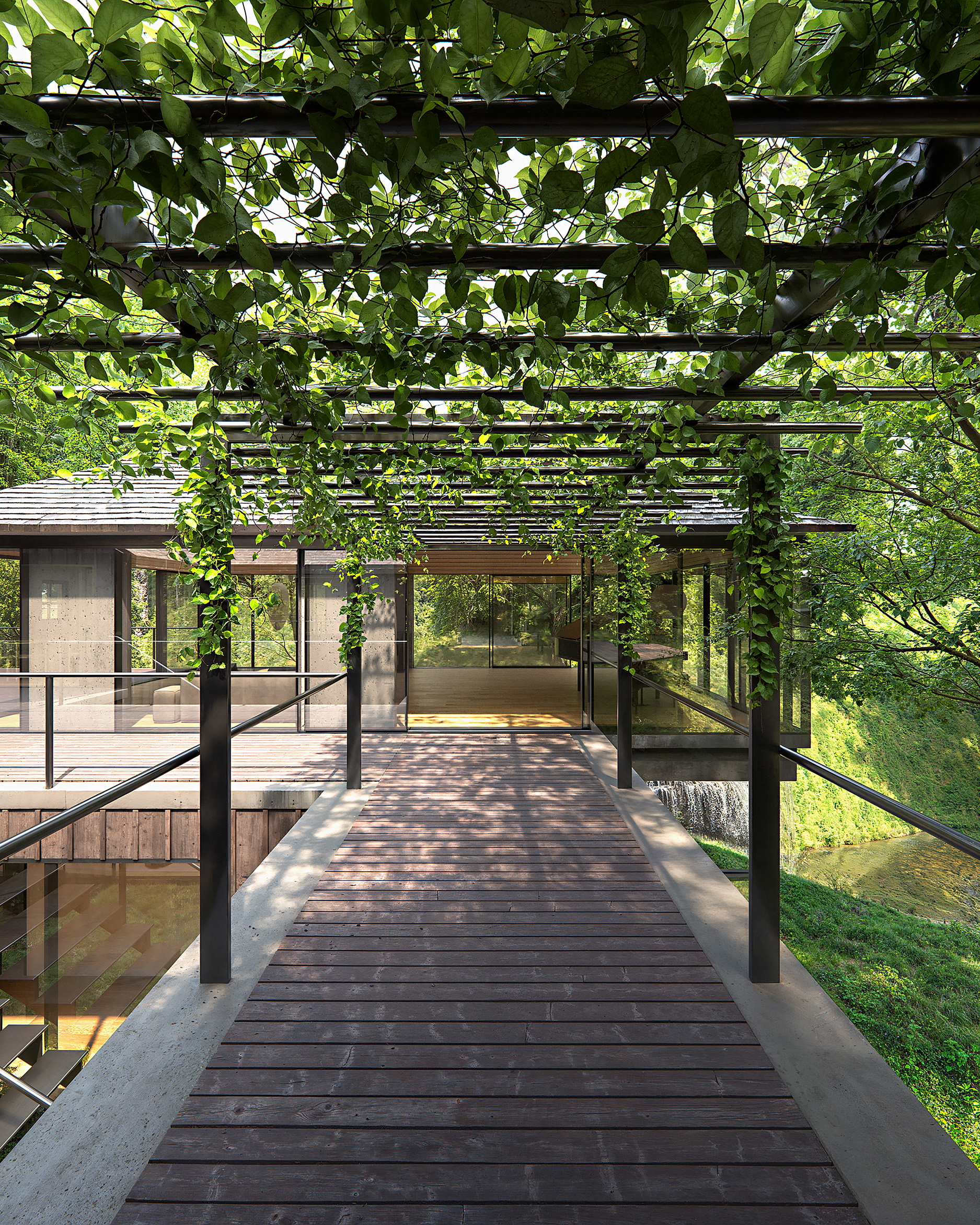 The waterfall retreat preserves the original Howard House, a humble structure that has undergone rounds of reuse and extension over decades as a time capsule of the family’s collective memory. Retaining the cottage not only honors the history of the site but also allows compliance with current street setback regulations, minimizing the construction's environmental impact and reducing the impact on local biodiversity. With the Level 1 envelope of the cottage left untouched, the new extension unfolds at the basement level, reaching west toward the creek and forest to accommodate additional programs. At its center, a winter garden introduces natural light and ventilation, around which bedrooms and communal spaces are arranged. Each bedroom functions as a private suite with forest views and windowed bathrooms, while the winter garden can fully open in favorable seasons to dissolve the boundary between inside and outside, promoting cross-ventilation and passive cooling. Above, a new glazed living room is positioned at the northwest corner, cantilevering as a belvedere over the waterfall. The living space shares the south terrace with the dining space and is connected to the cottage through a vegetated trellis. These spaces can open entirely and form a continuous space depending on weather and events.